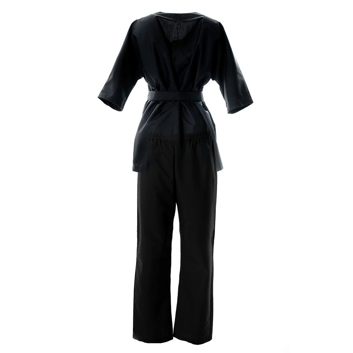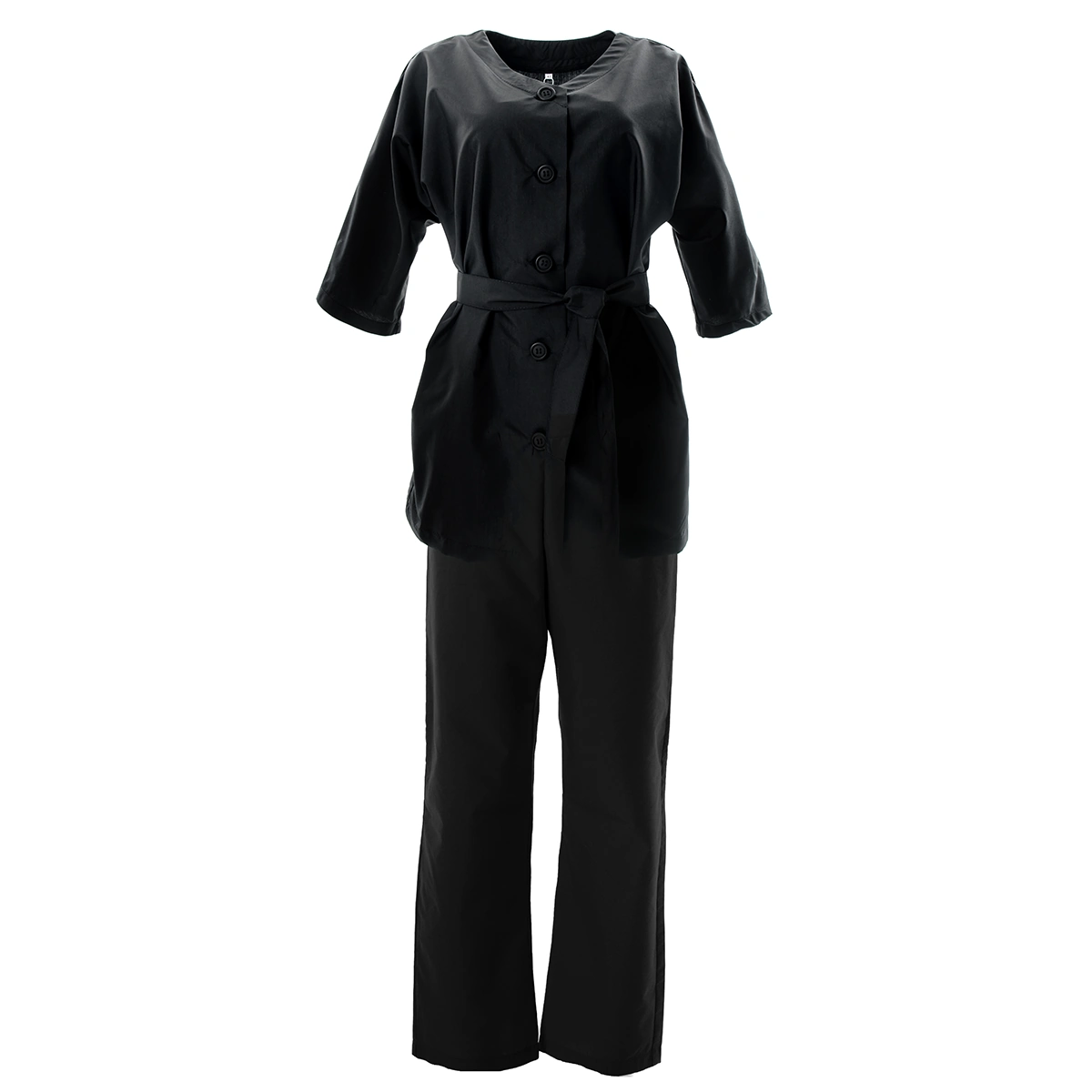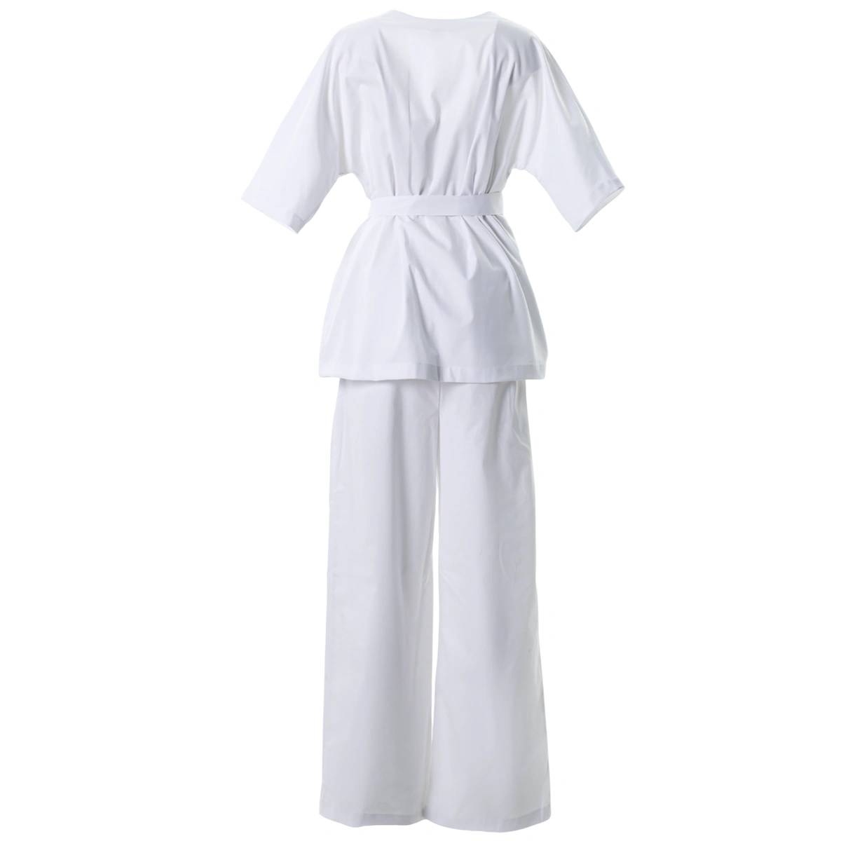 Комплект состоит из блузы-трансформера с рукавом 3/4 и широких прямых брюк палаццо. На талии штанов вставлена мягкая резинка, также на брюках удобные карманы. Пояс рубашки дает возможность отрегулировать посадку по размеру и акцентирует внимание на женственности фигуры. Рубашка-трансформер позволяет носить форму в трех вариациях.